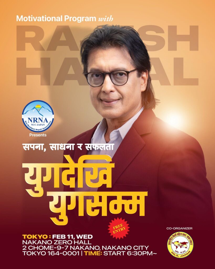 गैरआवासीय नेपाली संघ (NRNA NCC–Japan) को आयोजनामा तथा INLS Japan को सह–आयोजनामा हुन लागेको यो प्रेरणादायी कार्यक्रम आगामी फेब्रुअरी ११ (बुधबार) का दिन Nakano Zero Hall, Tokyo मा साँझ ६:३० बजेबाट सुरु हुनेछ।